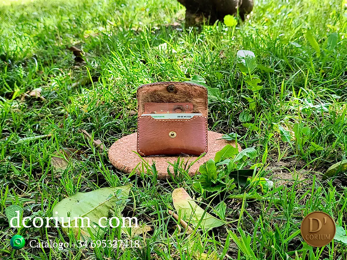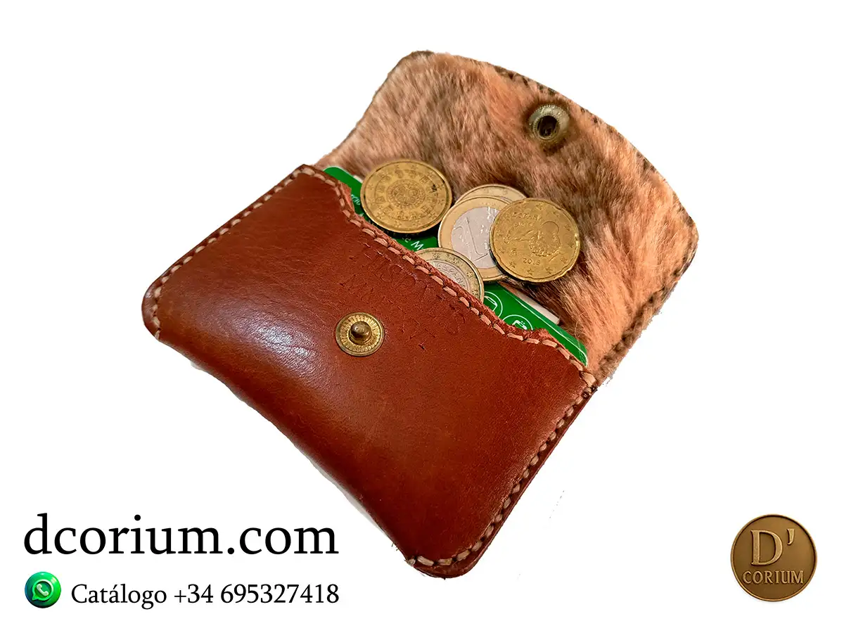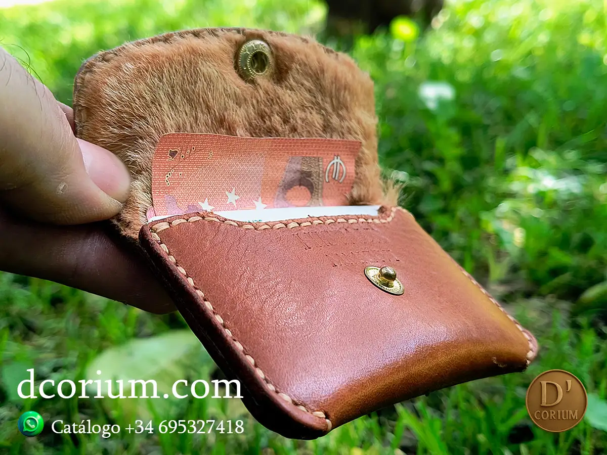 Es una cartera singular en la que puedes meter algunas tarjetas, billetes e incluso monedas. Confeccionada 100% a mano con piel de vacuno de calidad y forrada interiormente con pelo de cabra. La consideramos una minicartera por sus medidas y capacidad. Tiene 9,5 cm por 6,5 cm y un grosor de 1 cm estando vacía.