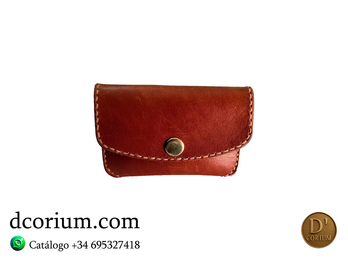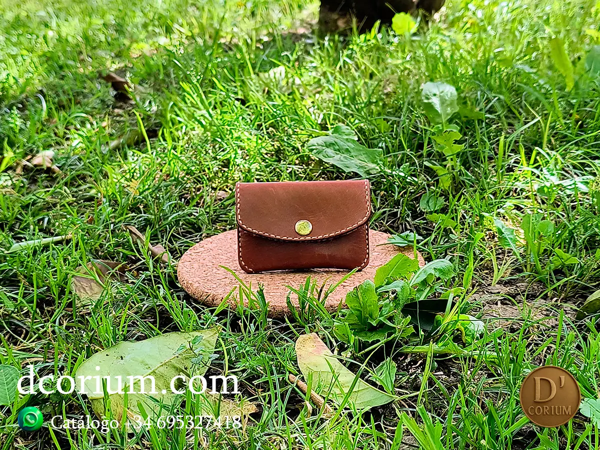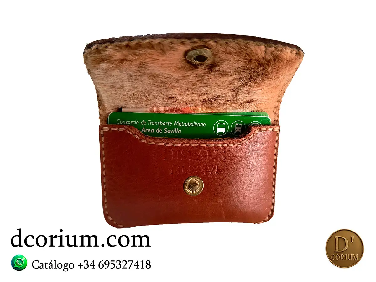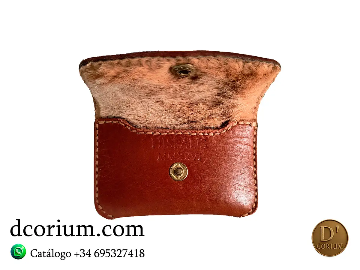 Es una cartera singular en la que puedes meter algunas tarjetas, billetes e incluso monedas. Confeccionada 100% a mano con piel de vacuno de calidad y forrada interiormente con pelo de cabra. La consideramos una minicartera por sus medidas y capacidad. Tiene 9,5 cm por 6,5 cm y un grosor de 1 cm estando vacía.